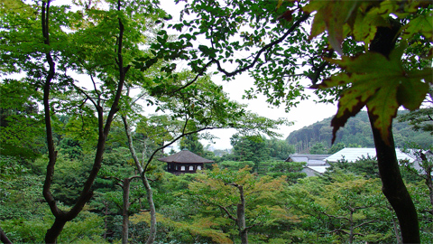 東山文化のモダンな山荘の佇まいは、美しい。 そしてしっとりと雨が降ってきた。