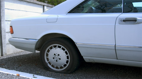 ジャッキアップしてスペアタイヤへの交換作業。 朝から疲れました・・・