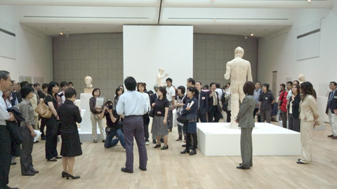 朝からの映像セッティングを終え、プレスの方々への藝大薩摩教授による展示品解説。