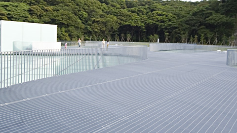 屋上のグレーチングデッキ。 ヒールを履いた女性は歩けない床です。。 模型の段階では、白で 綺麗だったんだろうなということが予想できますが、、 なんで グレーにしてしまったんだ。。。 ここだけ 重いデザイン