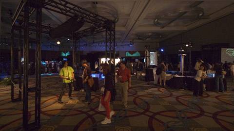『ArtGallery』全体の会場はまだ午前中ということもあり、こんな出足。 作品も2年前と同様に日本からの出展も目立つ。 写真左も慶応大学からの作品。 加速度センサーと空気圧センサーを持ち、 握らせるインターフェイスで 「ぐえーぇぇ・・おえぇぇ。。」とか 音がなる。。気持ち悪い。