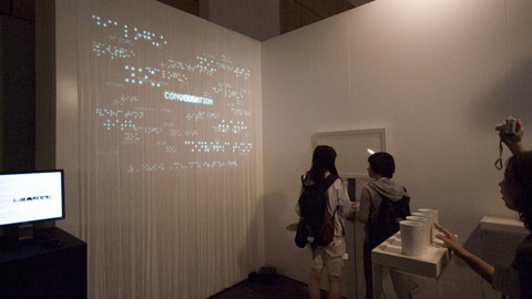 こちらは韓国からの出展。 点字を指でなぞるとビジュアルの変化と音声が出る。 説明を受けたが韓国語のため 作者の正確な意図はわからなかったが、 目の見えない人の点字認識が健常者に対してビジュアル化したものではないかと思う。 普段あの人はこうやって感じているんだ。と客観的に見せ、それをカッコよく見せているアート。