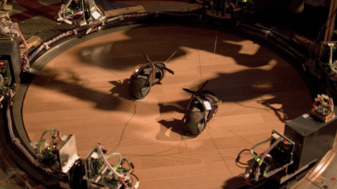 こちらの大掛かりな仕掛けは筑波大学。 サンダルにワイヤーを6本巡らせ、「歩く」というインターフェイス。 実際に体験しました。 一歩歩くと次の反対の足を出す前にワイヤーで引き戻され永遠と歩き続ける仕掛け。 こういう未成熟の分野にとても魅力を感じます。。