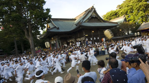 八幡宮の拝殿にて打ち鳴らす太鼓を合図に一斉に走り出す神輿の担ぎ手たち。