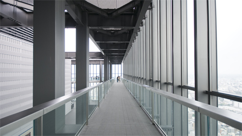 展望台を見つけてパノラマ写真はとれますか?と尋ねて、ご自由に。 といわれ、 あがってきたのですが、この屋上につくられたスロープはすごかったですが、 スカイウォークとファーリングの間に微妙な空間がありどう頑張っても パノラマなんて取れないじゃないですか。。。 パンフレットに掲載された360度写真は 誇大広告です・・・・