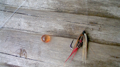 今日の毛鉤と、飛び出してきたイクラのような卵。