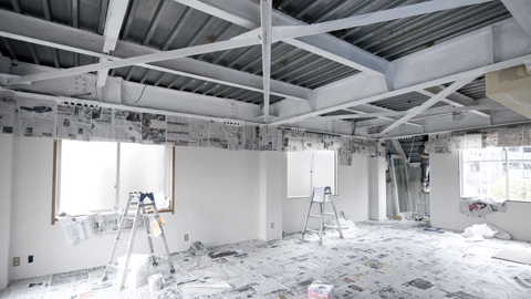 日曜日は朝から本気でペンキ塗り。 7リットルの塗料も使いきり、あと二缶追加。 だんだんと空間の雰囲気が変わり、普段のCGでのイメージではないリアルリノベーションは面白い。 疲労とともに、充実感も増してきます。