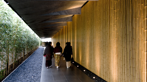 帰り路もこのアプローチ。配された竹にライトアップがされていた。