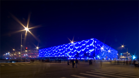 隣に移り、水立方。 オーストラリアの設計事務所PTW Architects イギリスのエンジニアリング会社Arup と、中国の設計事務所、中建国際設計公司(CCDI)が設計。 なんだか中国の建物なのに、CCDIはちょっと脇役的存在か?