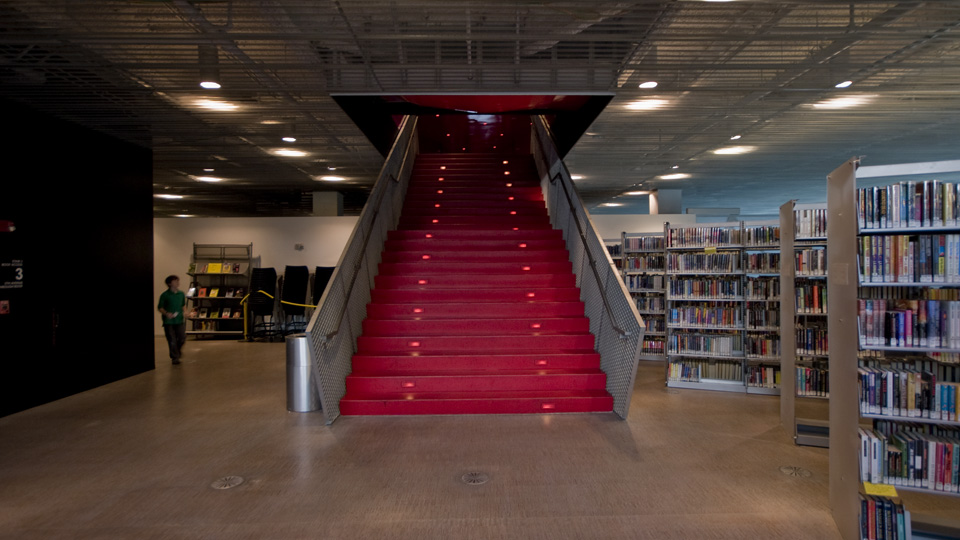 黄色いエスカレーターの次は赤い階段。