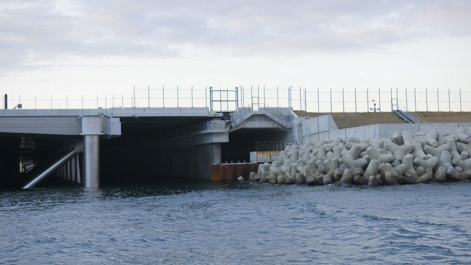 多摩川河口付近の海上に、従来の埋め立てとジャケット工法による桟橋を組み合わせた、