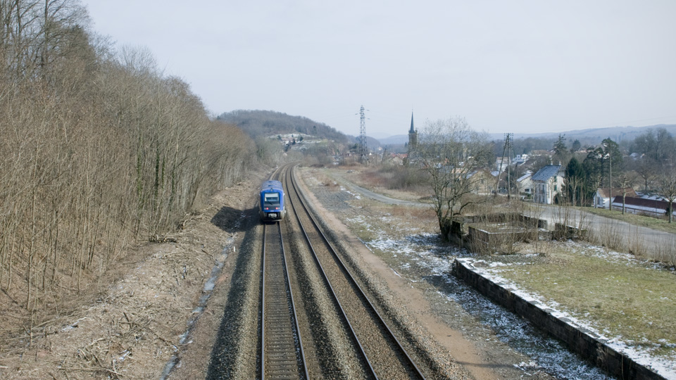 二両の青い電車はBelfortへ。 そういえばパンタグラフがなくすっきりしてる。。。