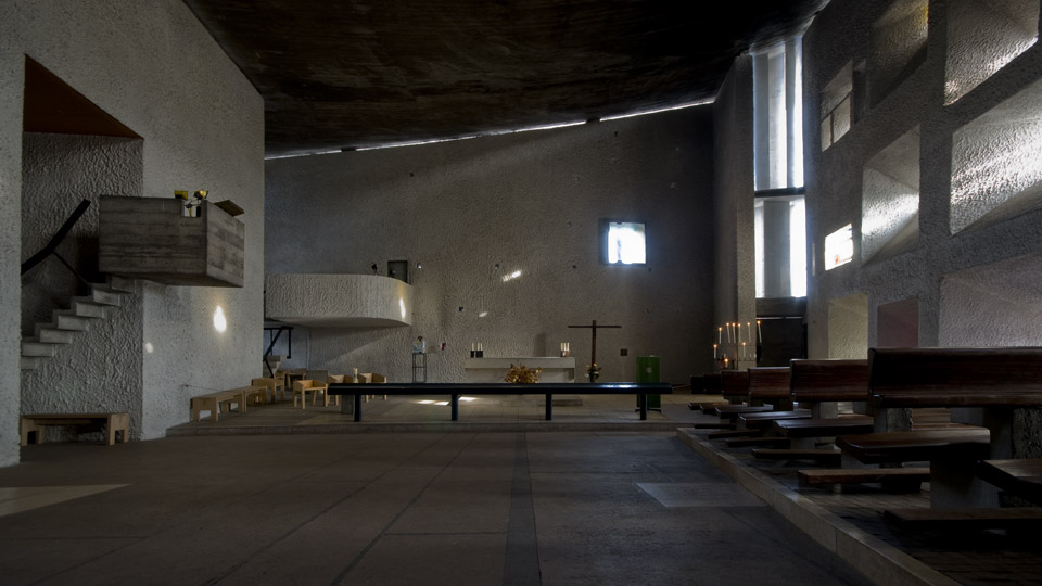 ステンドグラスやスリットからやわらかく降り注ぐ光に満ちた内部