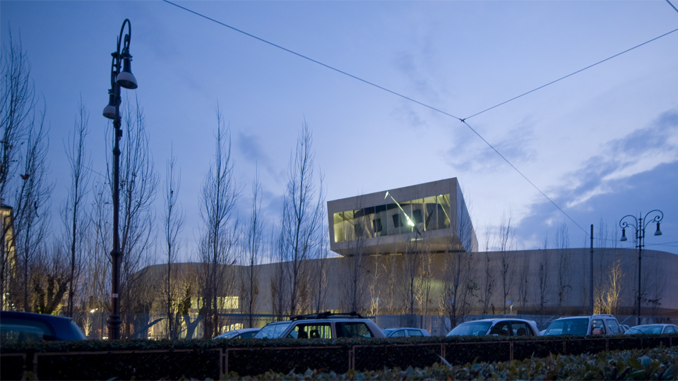 敷地周辺からの ライトアップされた外観。