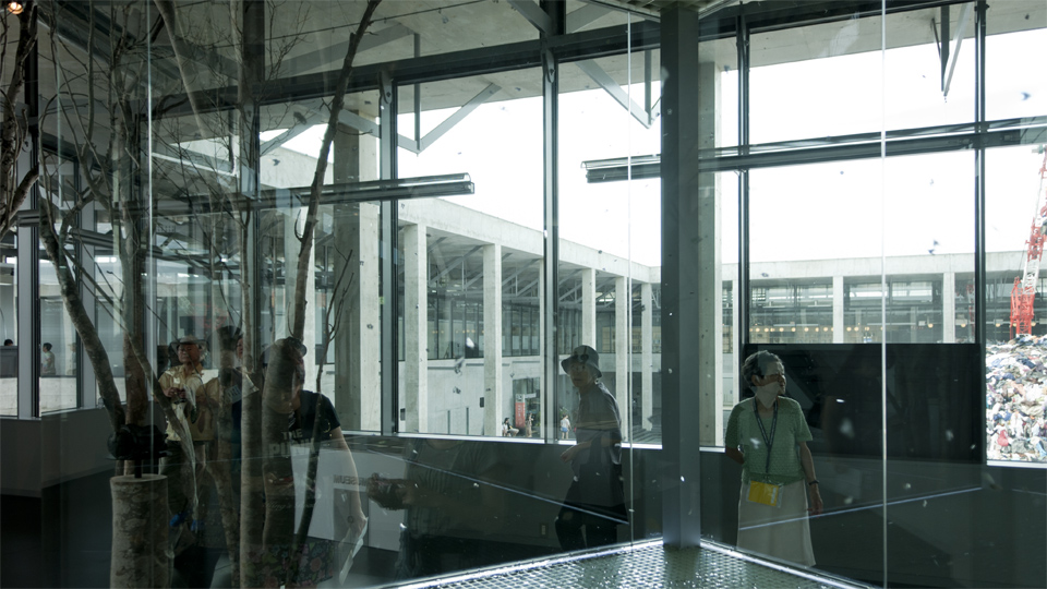 ガラスの中に 家型に切り抜かれた銀紙が舞う。