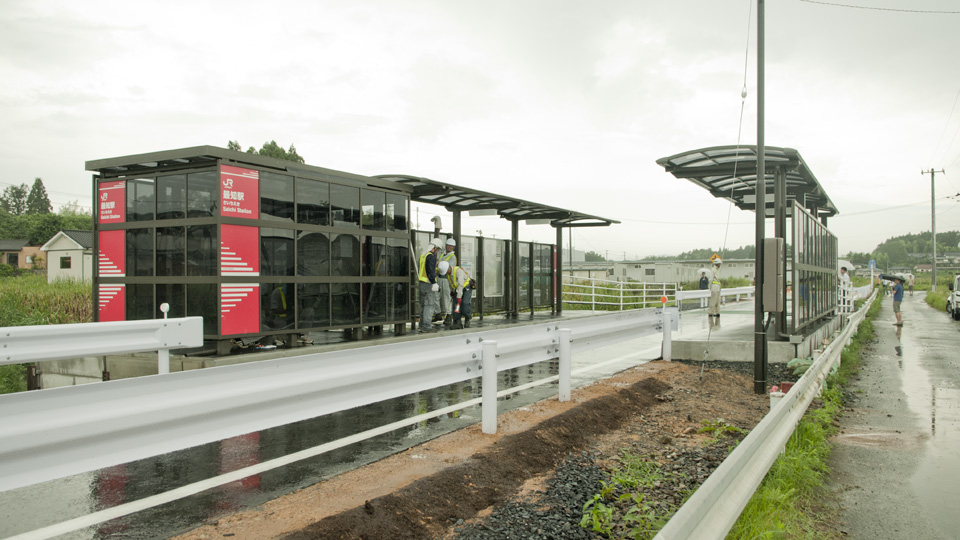 最知駅-陸前階上間。 この区間は直線で実験的、工期短縮という要素があったのだろう。 線路は取り除かれ アスファルトと 新設された駅。 日経新聞でも出発式の様子がすでに取り上げられている。 http://www.nikkei.com/article/DGXZZO45229030R20C12A8000000/