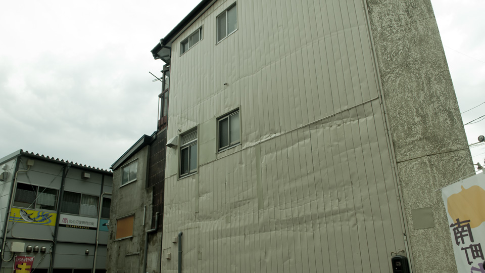 1Fは水につかり その上に浮いた瓦礫が2階の上にまで傷をつけています。