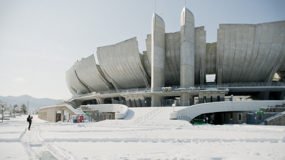 今年の1月の三連休 成人式は首都圏も大雪。 そんな大雪のなか長野へ。締め切りに追われながらの撮影に踏み切ったためご覧の積雪。真っ白。 札幌の次、冬季五輪としては日本2回目の開催地。 スタンドの躯体はサクラの花をモチーフにデザインされており、 内野2階スタンドが花びらを、6基の照明塔が花弁を模している。 ということ。類設計。