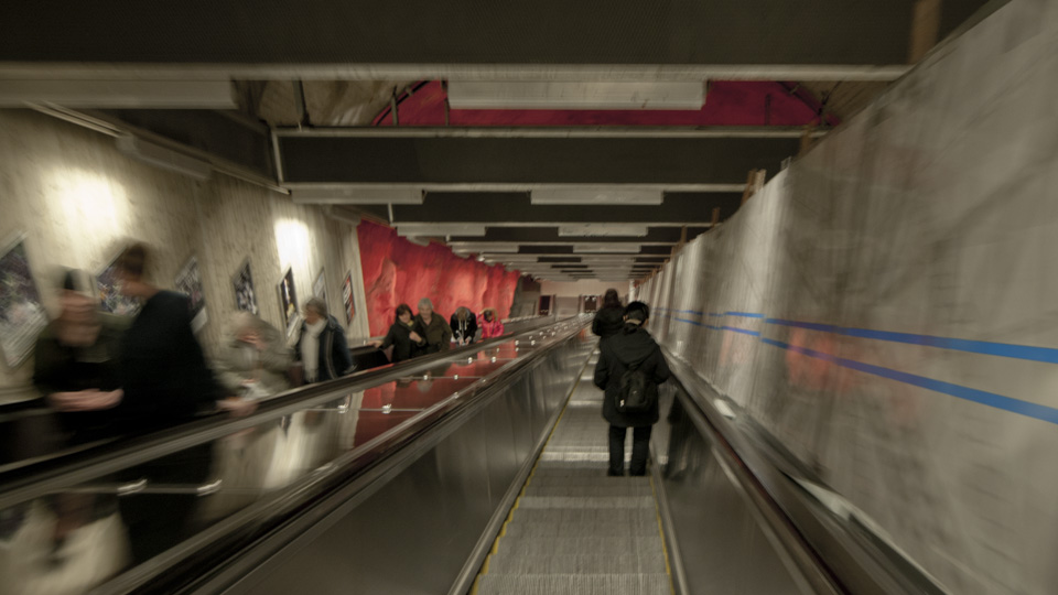 Solna と Solna centrum は全く違う路線だよ。と Solnaの改札で教えてもらう・・ インフォメーションカウンタでの聞き方がが間違ってたのか。。 でも路線バスを教えてもらい 15分ほどで軌道修正。 さぁ 洞窟のホームに降りていきます。 気分は遊園地。