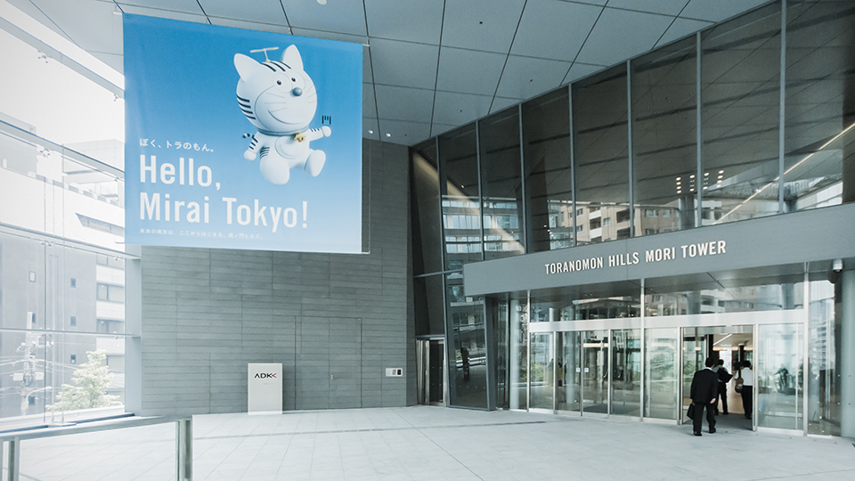 白黒のドラえもん。「とらのもん」がお出迎え。