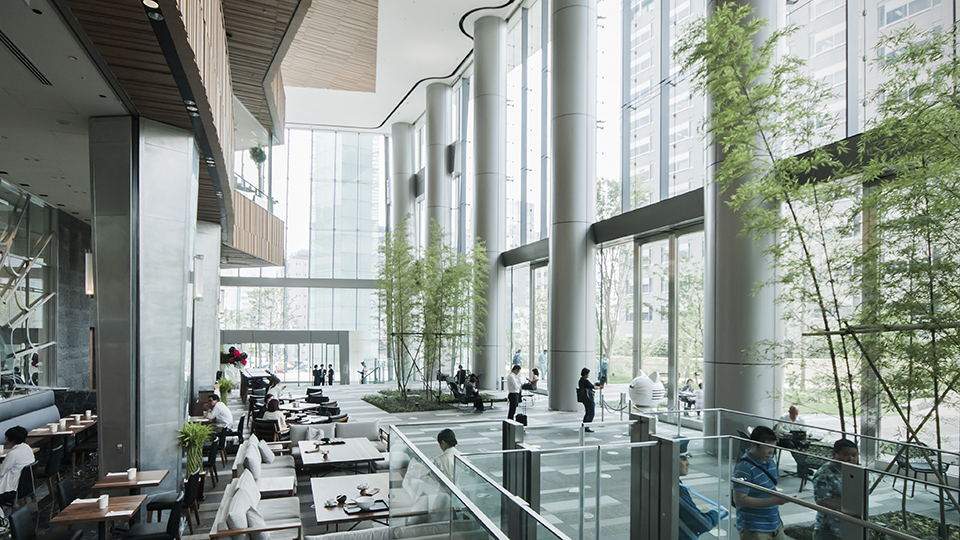 内と外が連続したステップガーデン、アトリウム。 僕はこの空間が一番 設計者の得意なところを押し出したように感じる。 そして浜離宮インターシティをもっと複合的な街にした感じ。 右側に見えているシルバーの柱が 地下の道路を跨いでいます。