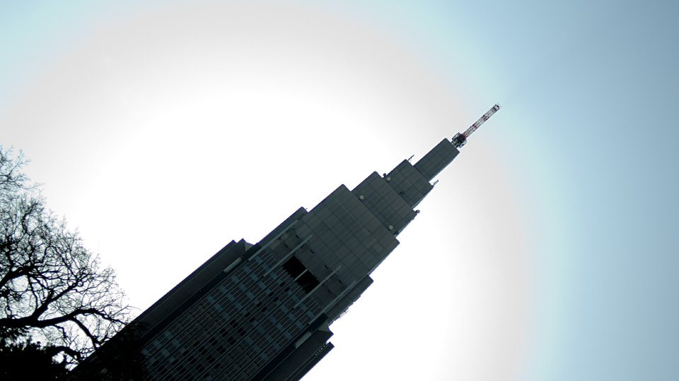 芝生に寝転んだところで 逆光のドコモタワー