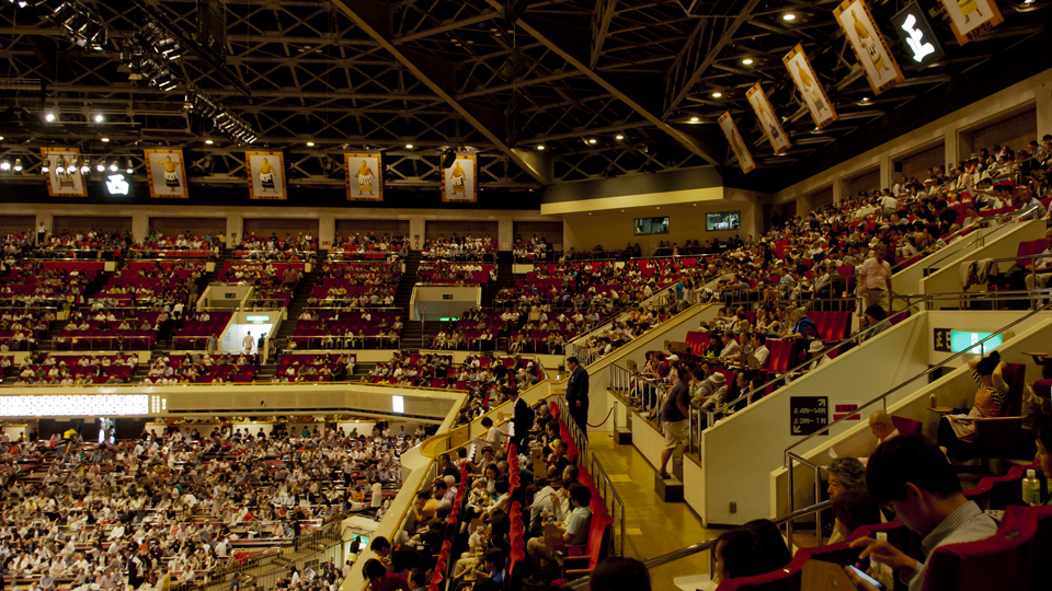 幕内取組の時間になるとどんどん席が埋まってきます。 そして 2階席の最上段近くは 外国人の姿が多数。ツアーの旗振りに先導されて 続々と多国籍な雰囲気になってきます。 海外旅行でこの空間で観戦できたらCoolと思うはず。