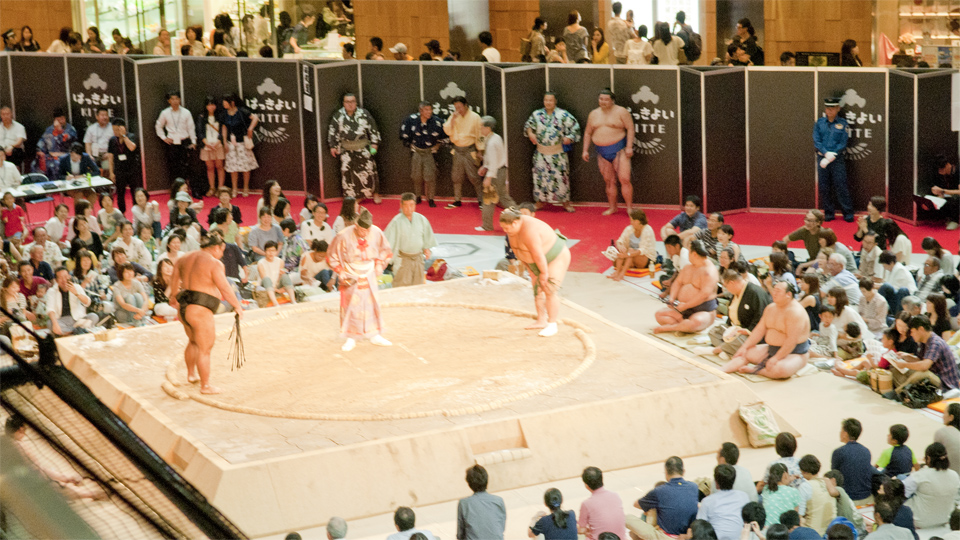 1Fでチケットのあるお客さんはこんな感じ。 各地巡業あれど、こんなに近くてこんなに少人数なのはここKITTEだけでしょう。 とても 羨ましい土俵の近さ。 ちなみに黒いつい立まであるので1Fからは取り組みは全く見えず・・・