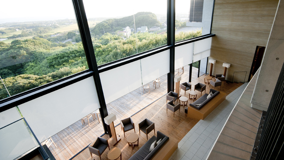 2層吹抜けのあるエントランスロビーからは太平洋が見えます。