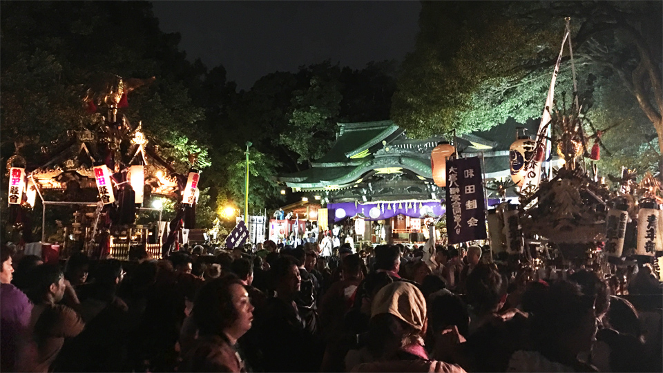 地区の神輿が次々と境内に入ってきます。 計9基が社殿の前に集結します。