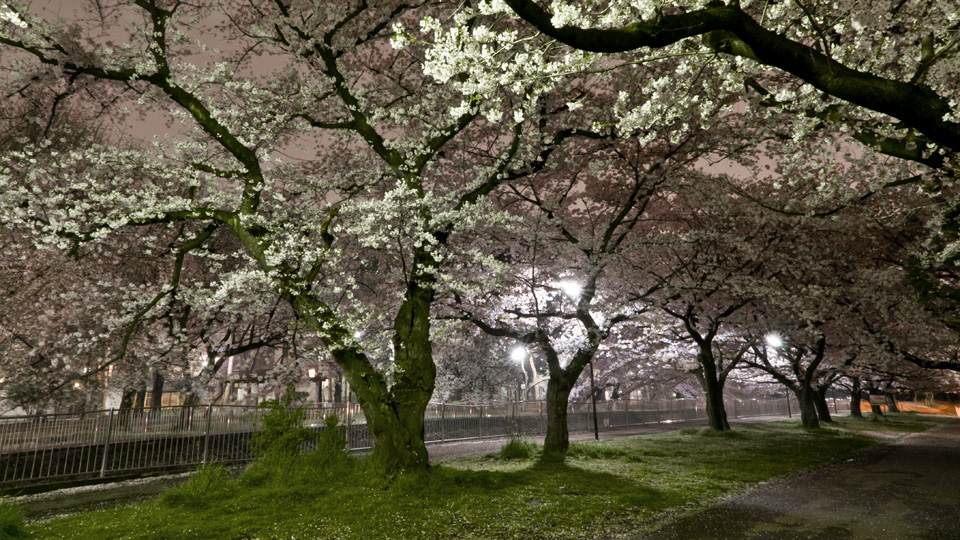 ライトアップのない、街灯での夜桜。