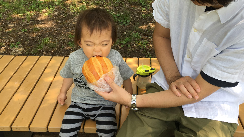 午前中から外でパンをほうばっています。