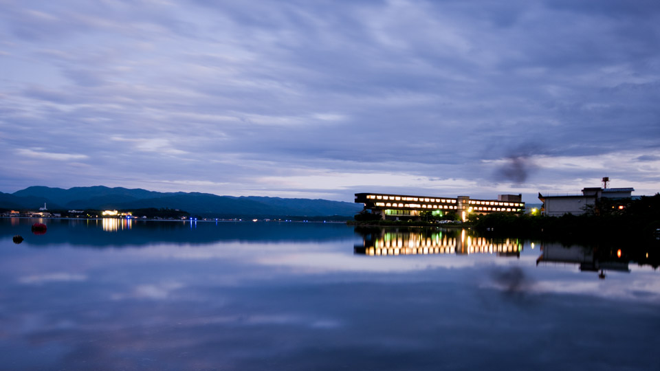そして両津港までたどり着き、本日の宿が加茂湖の向こうに見えてきた。 トワイライトに染まる 佐渡グランドホテル。 設計 菊竹清訓
