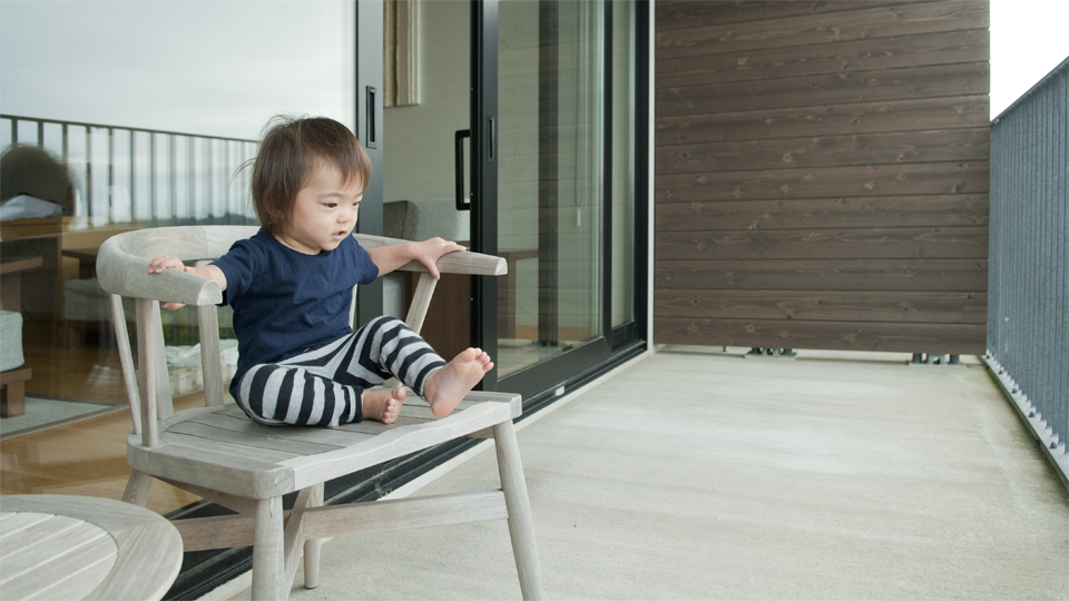 二人でベランダでくつろぐ。今回の部屋は オーシャンビュー。