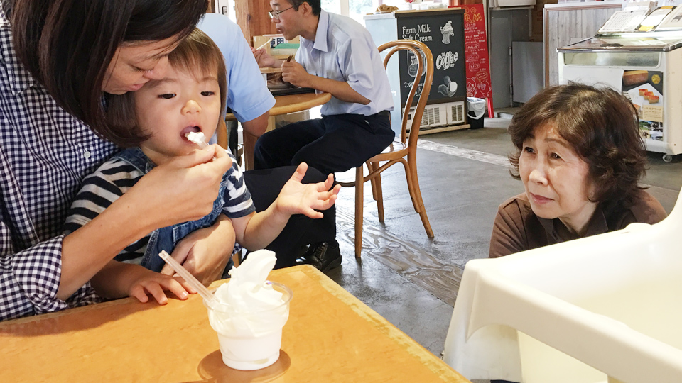 近藤牧場のソフトクリーム。初めて食べさせた。