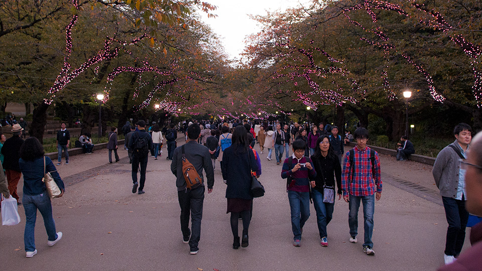 文化の日の上野。充実。桜がすごいここにピンク色をのイルミネーションがありました。