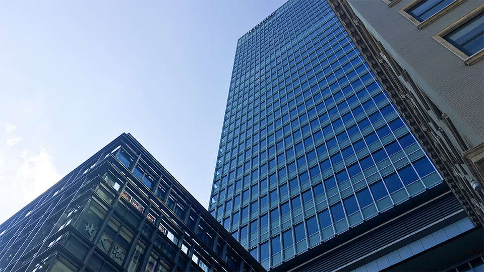 中央通りからの見あげ。 明治屋京橋ビルと対をなす新旧のコントラストが低層部にあり、 現在のオフィスが積層されています。 明治屋は創業時の設計者:コンドルに学んだ曾根達蔵 中央区の歴史的建造物1号にも指定されており清水建設が保存改修を行っています。