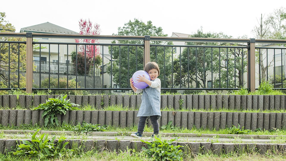 スロープ状の護岸、段々になった護岸でボールころがし。