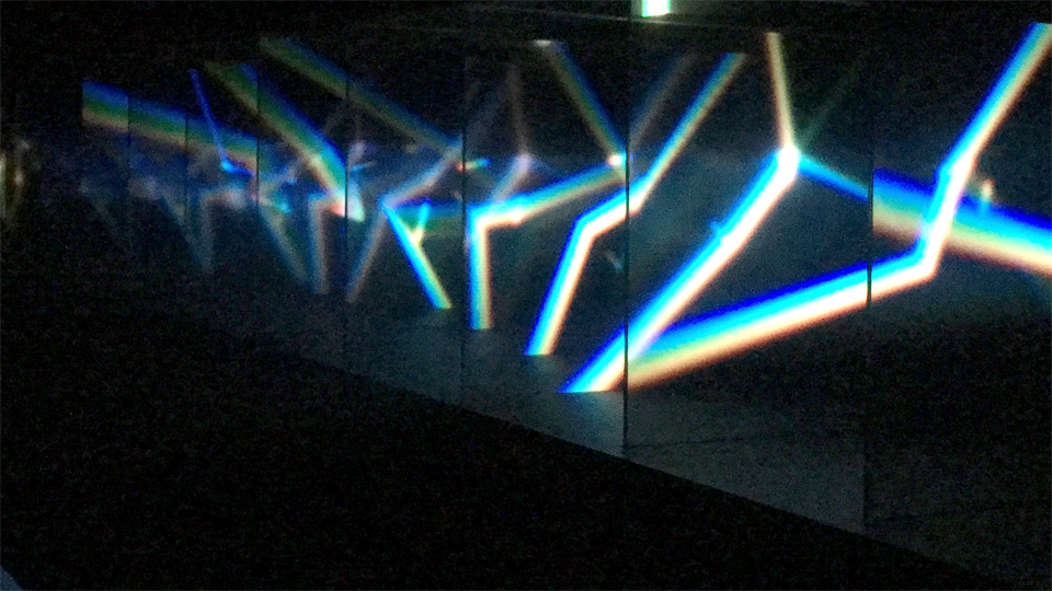シースルーのディスプレイが真っ暗な空間に並べられ、 ボリューム的な映像演出で新しい世界を作っていた。 まだこのモニタ 超高級品らしい。 もっともっとピッチを狭くして ギュッと詰めて並べれば 立体ディスプレイのような 演出にもつながる第一歩か。