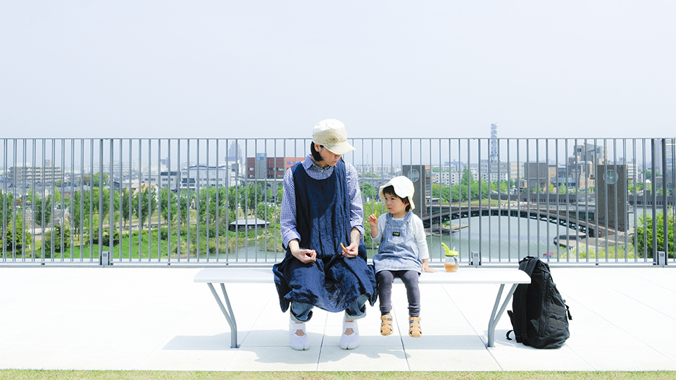 屋上のベンチで カナルパークを背にして休憩中。