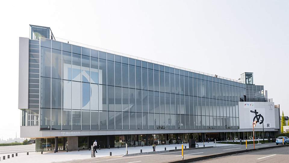 前面道路、環水公園側に大きく開けたカーテンウォール。 公園の全体構想のなかで生きる美術館にしようとする内藤先生の切り口。 コンペのときのパースもここで行われるアクティビティをこだわって描いたと聞いた。