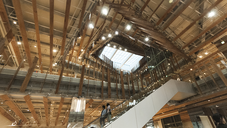 見上げて見ごたえのある 吹抜けと天井。 おばちゃんから、工事中みたいな建物ね。と聞こえてきたが またそれも隈建築の狙いかもしれないと なにか妙に一人で納得。 どこか親しみやすく 市民の集まる建物になっていくんだろうなと想像できました。