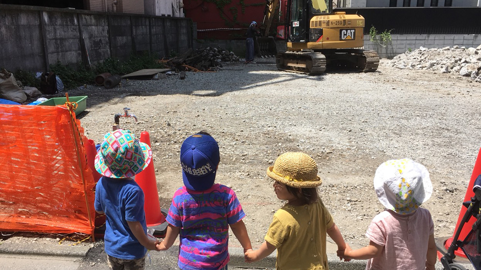 手をつないでみんなでショベルカーを見学。 子供ってなんでみんな現場好きなのか。