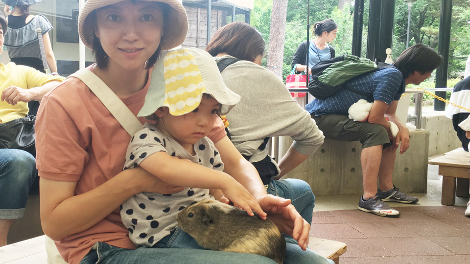 恐る恐るモルモットの体験コーナーで 背中を撫でてみる。 最初はかかりビビっていたが、 最後に自分から 触ってみようと思ったのか勇気がでたのか。ちょっとだけ触った。 まぁ 得体のしれない物体を触るのは確かに怖いな。 「モルモット」って言葉でも言えないんだもん。