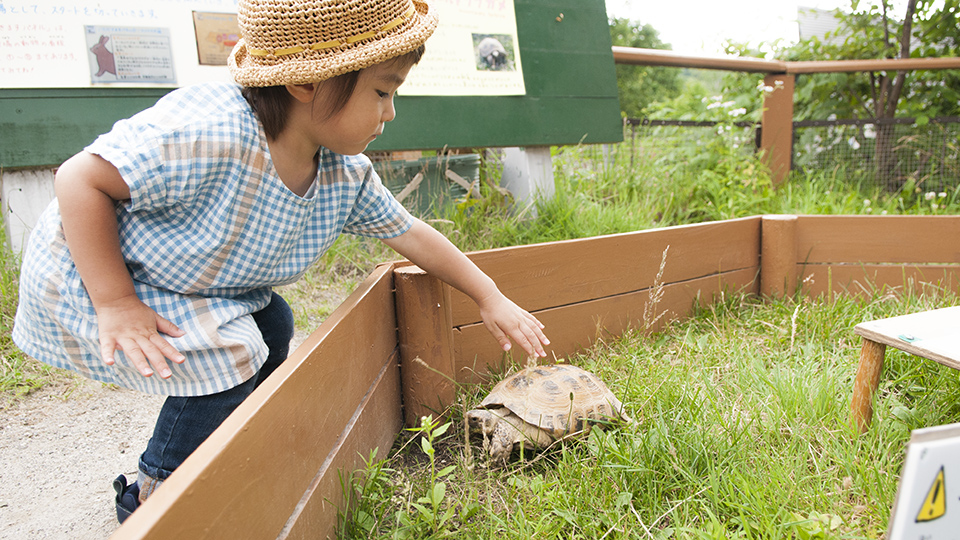 触れるキッズコーナーで 果敢に亀を攻める木花。