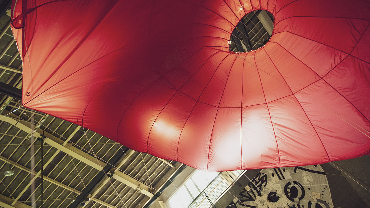 赤い大きなパラシュートがふわりふわり。