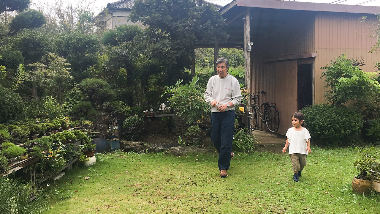 今日はのんびり家の庭でおじいちゃんと遊んでからお祭りに向かいます。