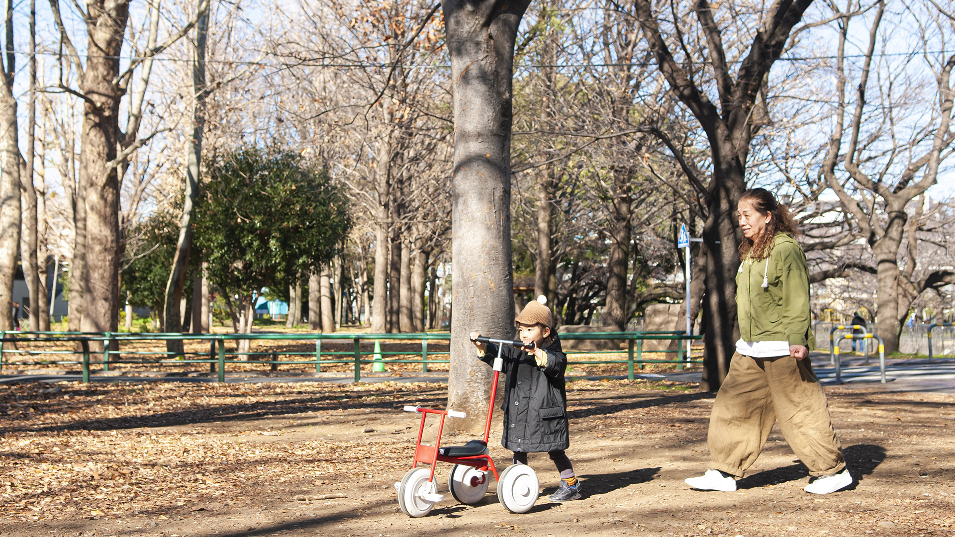 得意の三輪車をもって おばあちゃんと公園散歩