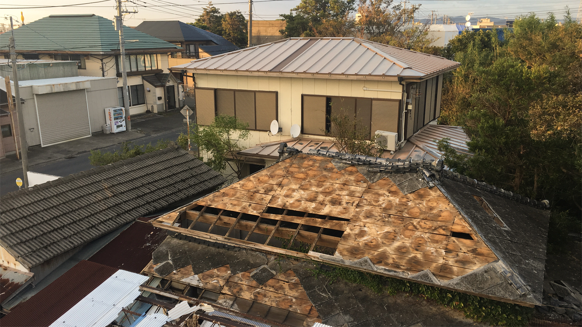 ただし 隣のもう空き家となっている祖母の姉宅は スレート瓦が南風でやられた。 雨も相当内部まで入ってきてしまったが、 住んでいないので応急処置だけしようということに。 今日はブルーシートが入手できず。明日の朝一で作業開始することにして もう一泊。
