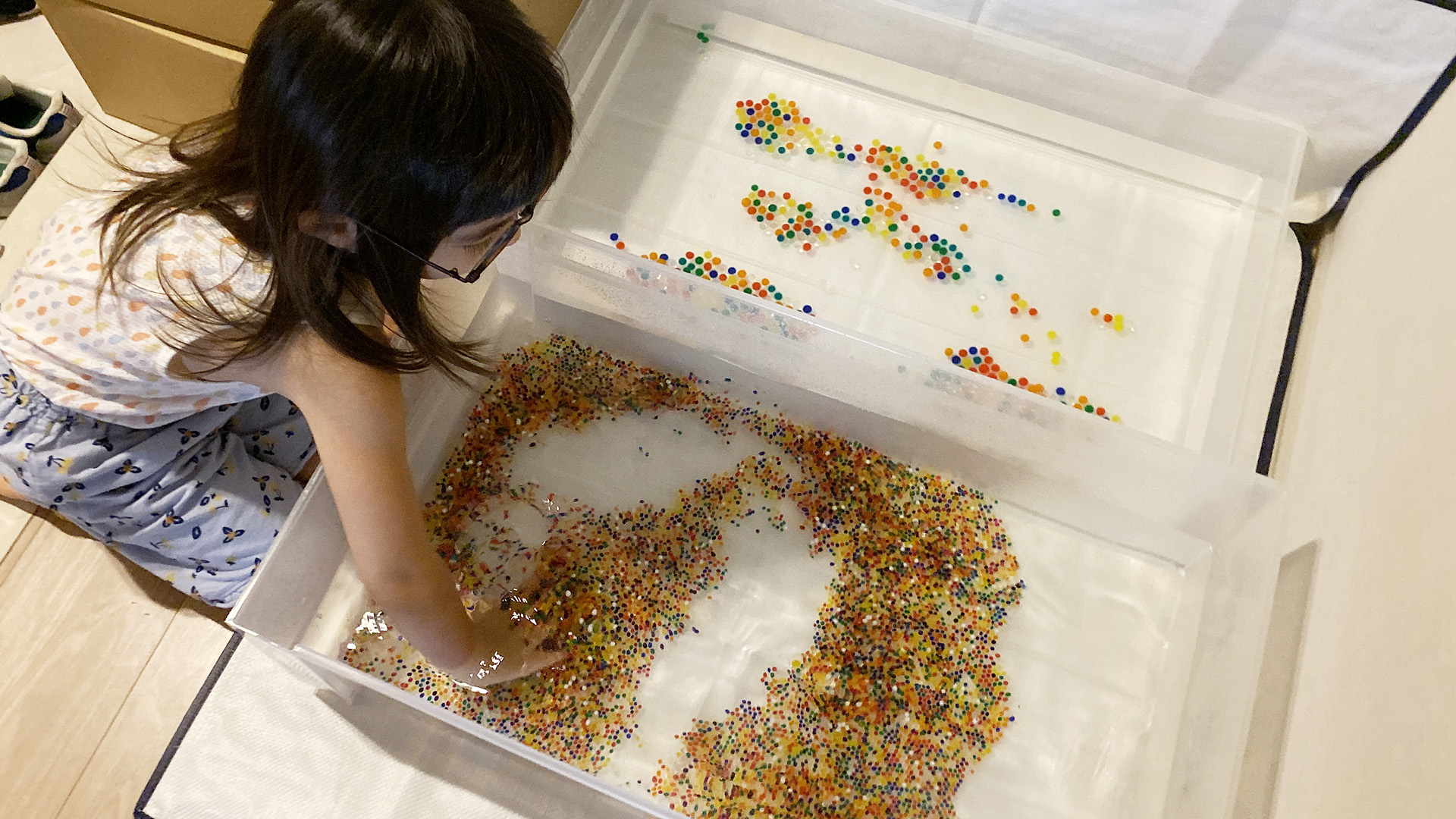 台風19号が甚大な被害で通り過ぎ 明日の秋祭りを開催するかと審議中のなか、 仕入てしまった ぷよぷよボールは台風一過の晴天を予想して衣装ケースで培養開始。 40000万個 一気に作ります。 上に映る少ないほうは 5倍ほどの大きさになる特別球